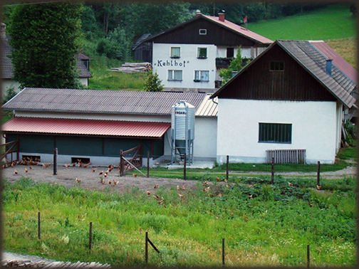 1997 erfolgte die Umstellung von der Mutterkuhhaltung auf Bio-Freilandhühner.Der ursprüngliche Kuhstall wurde zu einem Hühnerstall umgebaut, in dem sich nun 1100 Bio-Freilandhühner befinden.